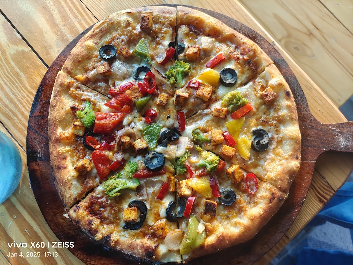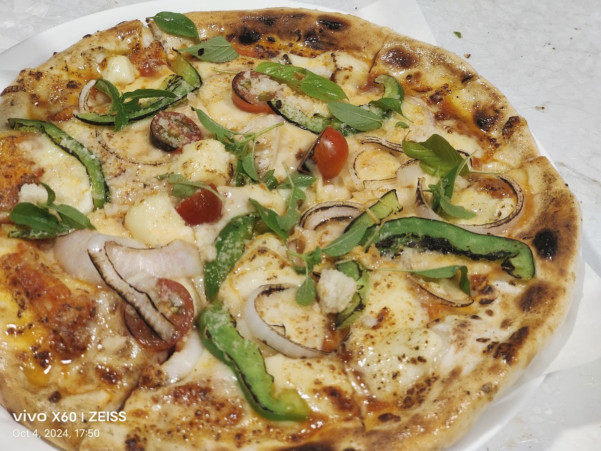 The wood-fired pizzas here are a key attraction and have earned a good local reputation for their authentic oven-baked texture and balanced flavors. Options like the classic Margherita or more adventurous offerings with jalapeños and chicken breast carry a rustic, home-style appeal rather than a fine-dining polish. Beyond pizza, the café’s variety of fresh juices—ranging from watermelon and mango to more unusual choices like custard apple and fig—offer a lively, refreshing alternative to the usual café fare.
