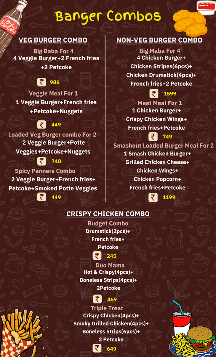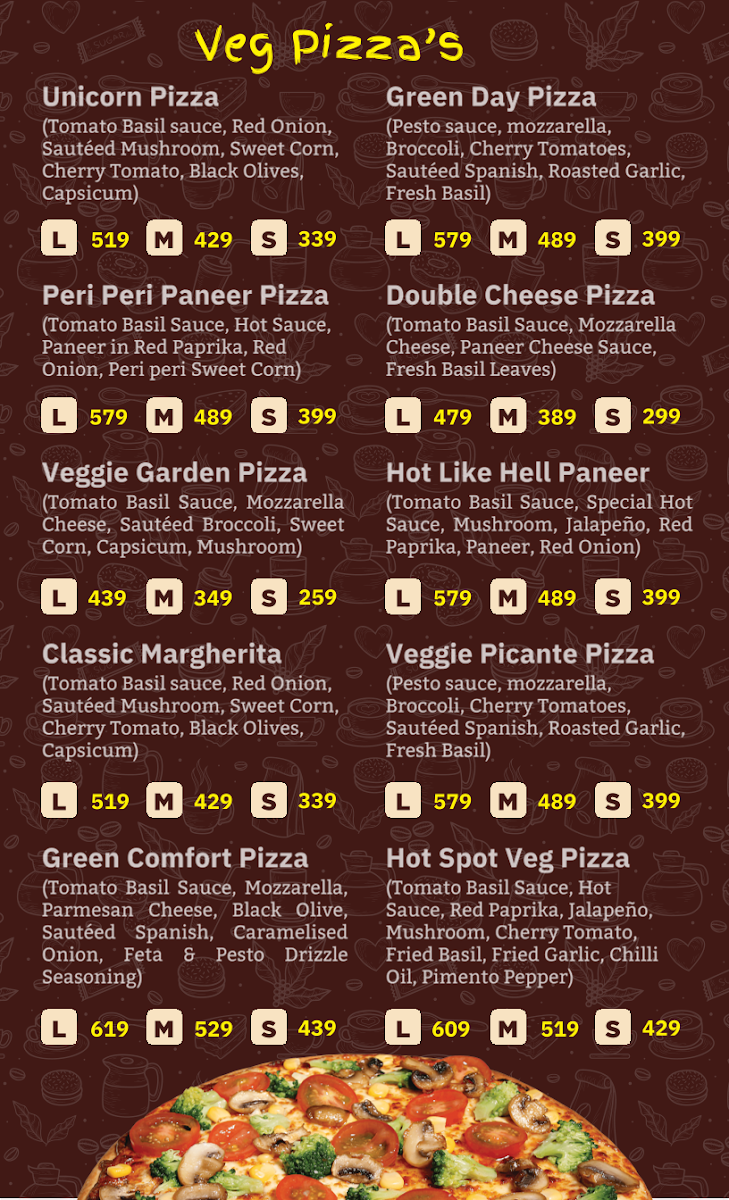 This menu structure supports a range of dining preferences, from light snacks and casual orders to filling meals with pizza and combo offers, suitable for lunch, dinner, or snack breaks.