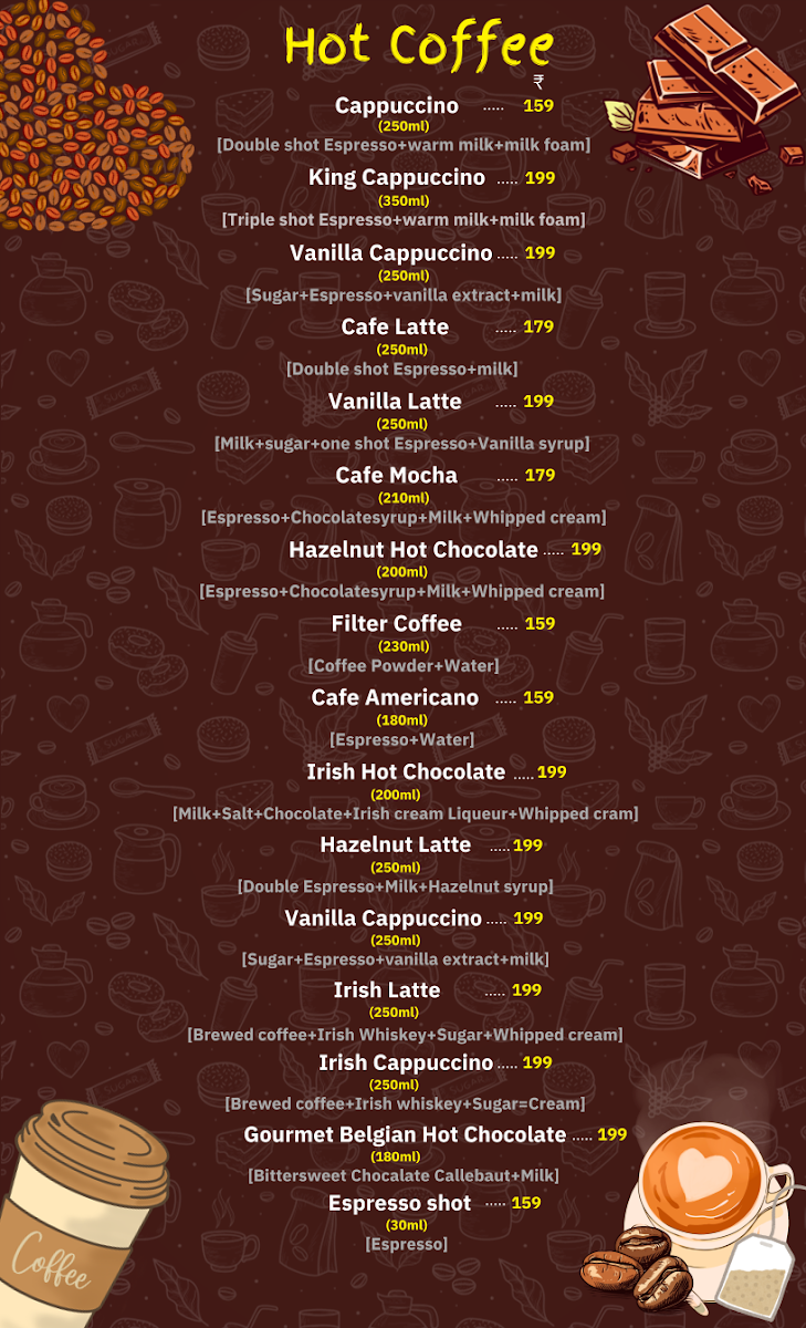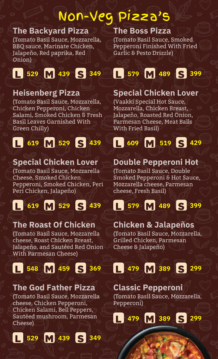 The menu offers a variety of food and beverage options suitable for casual dining or quick meals throughout the day. It features a selection of wood-fired pizzas including Napolitana Wood Fire Margherita Pizza and Chicken Salami Pizza, prepared in a traditional oven style.